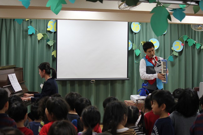 園歌発表の際、大友剛先生(ミュージシャン&マジシャン、NHK多数出演、ニューヨーク映画祭で銅賞を受賞)と一緒に共演できて、誠に光栄です。地域交流に力を入れたいと思います。