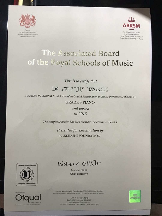 当教室生徒D君、2018英国王立音楽検定ビアノグレード3 に合格しました。おめでとうございます!